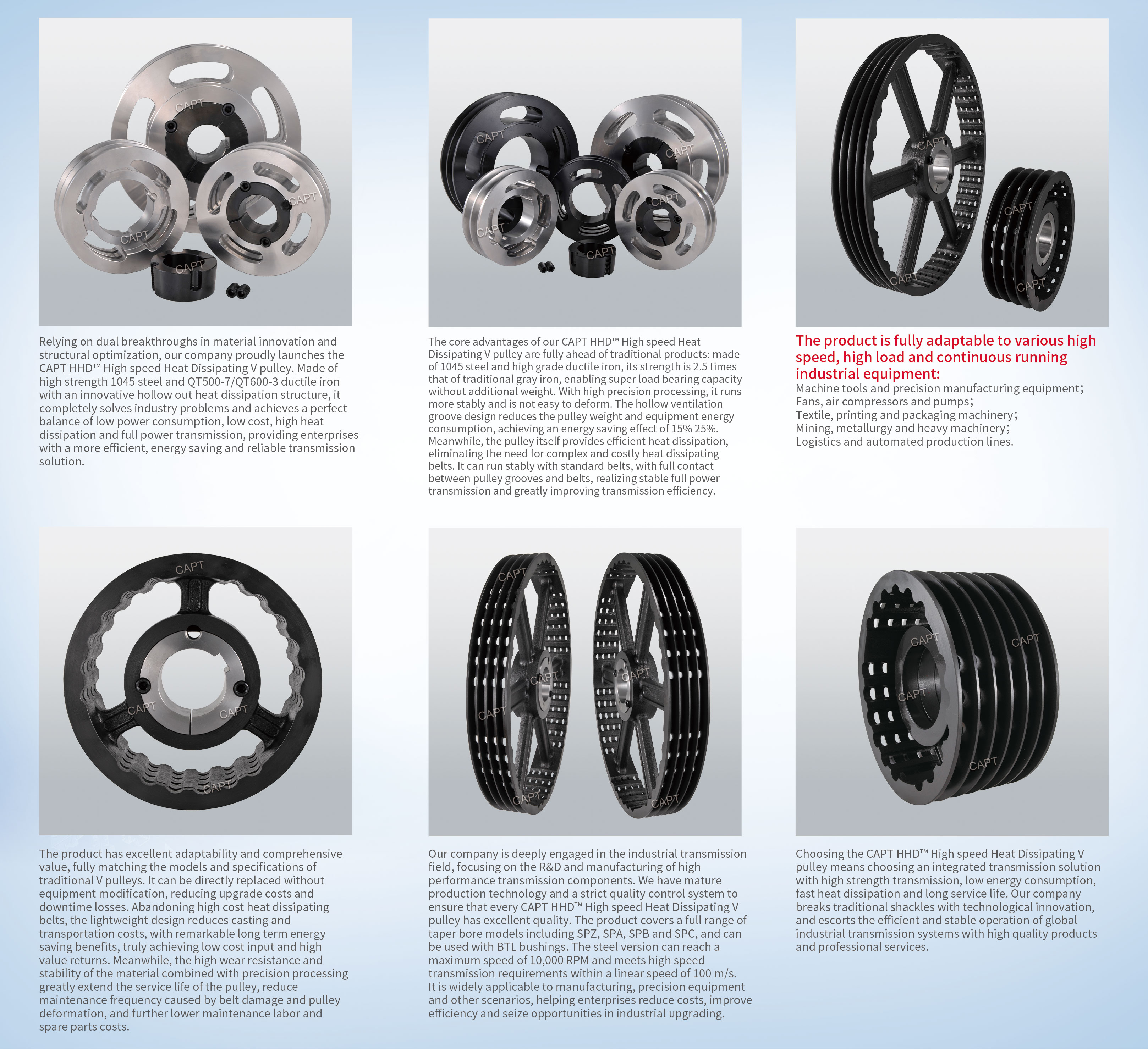 In the industrial transmission field, the pulley, as a core power transmission component, directly determines the operational efficiency, energy consumption cost and service life of equipment. Traditional gray iron pulleys have long been plagued by pain points such as insufficient strength, high energy consumption and unbalanced heat dissipation, while the heat-dissipating belt solutions on the market have fallen into a dilemma where "heat dissipation, efficiency and cost cannot be achieved simultaneously".