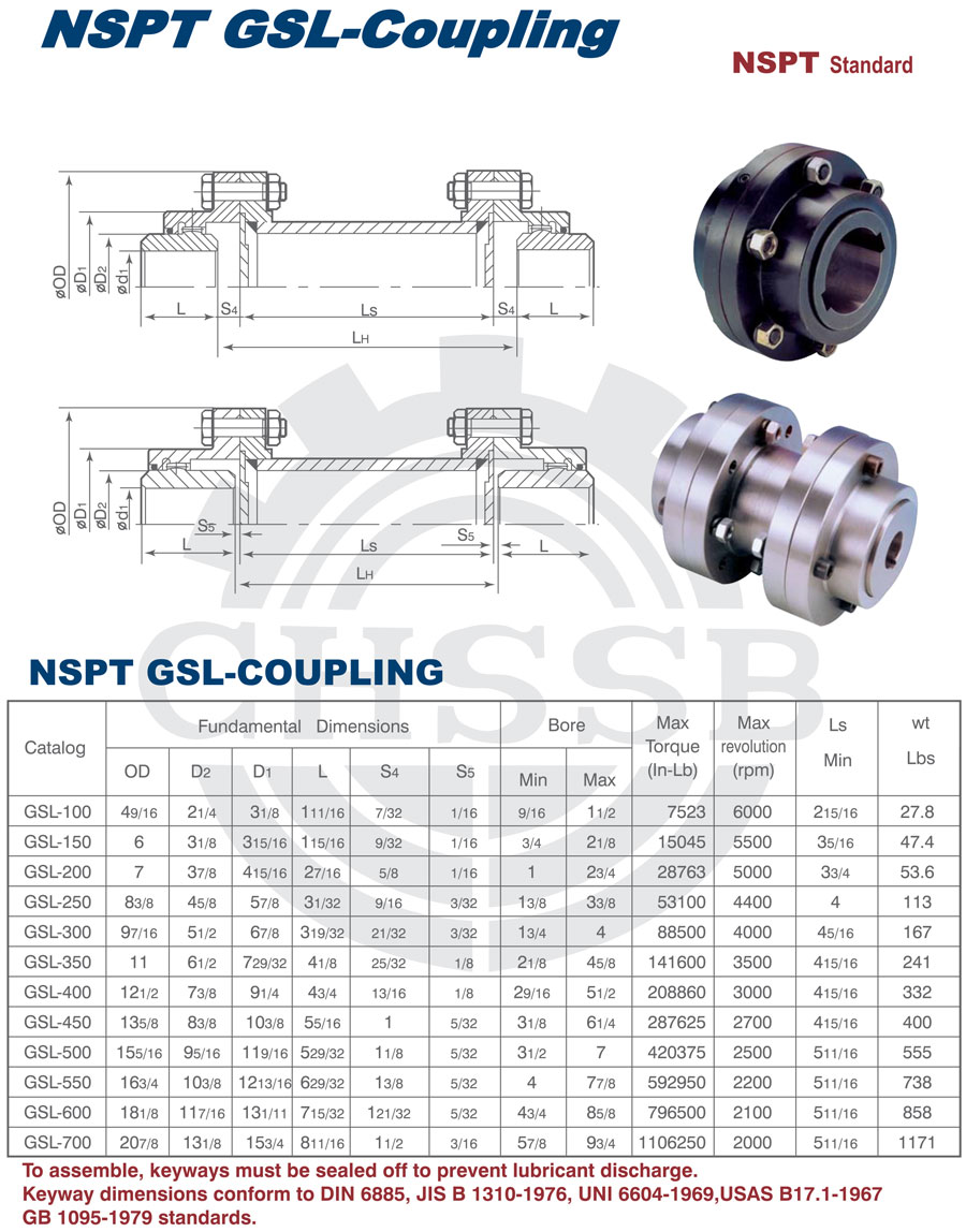 產品范圍: 美標/歐標:(GSL) 英制尺寸產品(適用于美標市場) 公制尺寸產品(適用于歐標市場) GSL型聯軸器
